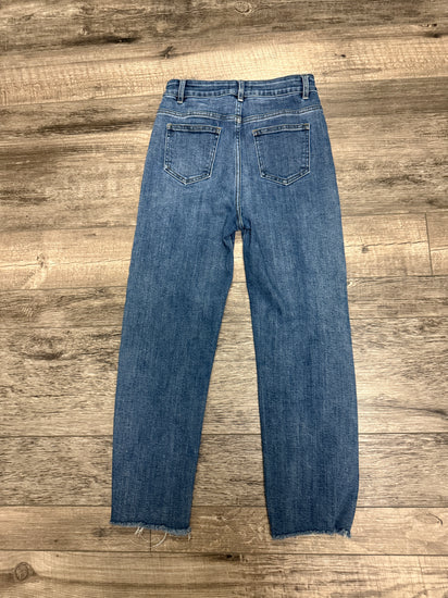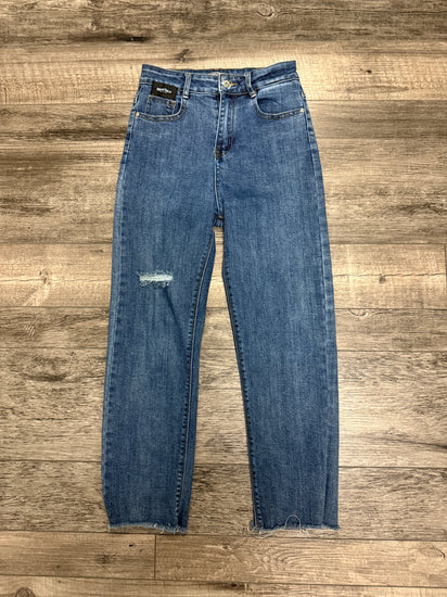 Description : Dark wash denim jeans with a distressed rip on the left thigh and frayed hem edges