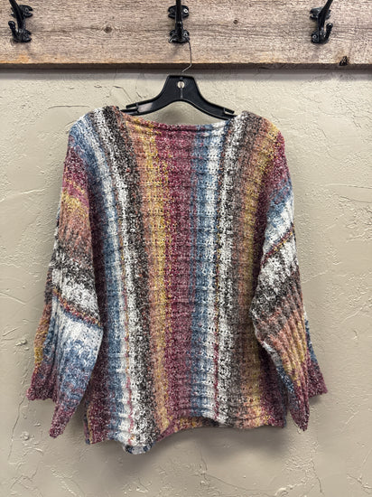 Description : Loose, textured knit sweater with a wide rounded neckline and dropped long sleeves, featuring vertical multicolored stripes in muted burgundy, mustard, denim blue, gray and cream. The fabric is soft and slightly fuzzy with a relaxed boxy fit.
