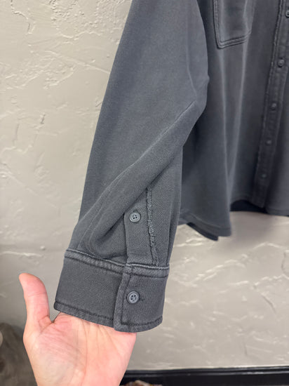 Description : Long-sleeve, oversized button-front shirt in a faded charcoal gray with a pointed collar, two front patch pockets and visible seam/topstitch detailing, made from a soft sweatshirt-like knit.