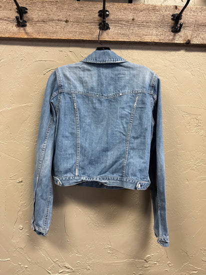 Description : Light wash denim jacket with a classic collar, button-front closure, chest flap pockets, vertical seam detailing and slightly cropped hem; visible metal buttons and subtle faded wash.