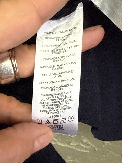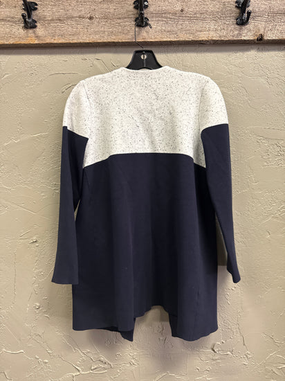 Description : Perfect spring or fall sweater jacket. Wear over loose jeans with crisp white t-shirt. This perfectly structured cardigan is both substantial and light weight. Features comfortable loose-fit with comfy deep pockets. Navy blue with cool white speckle top.