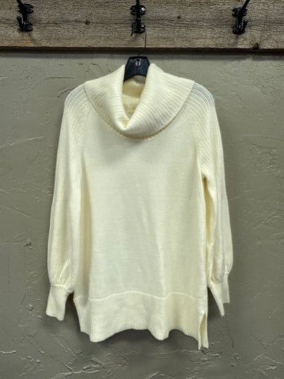 Description : Oversized, cream-colored sweater featuring a cowl neck and ribbed cuffs and hem