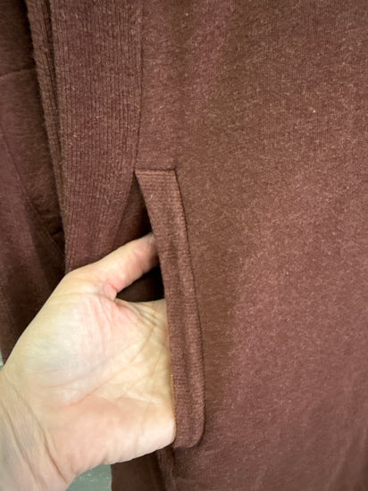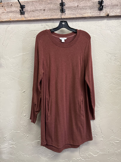 Description : Long-sleeve casual dress in a warm muted cinnamon with a crew neckline, simple A-line silhouette and two front slit pockets; soft knit fabric with a relaxed fit