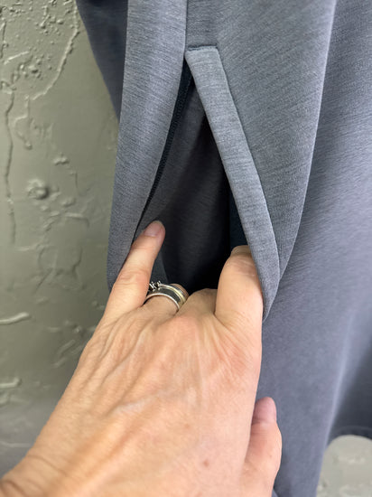 Description : Long-sleeve, knee-length charcoal gray dress in a sweatshirt knit with a wide cowl/funnel neckline, dropped shoulders, a relaxed A-line silhouette and zippered side pockets.