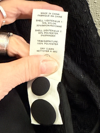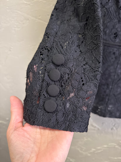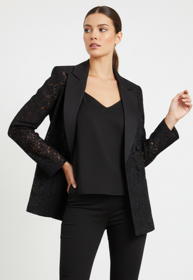 Description : Black double-breasted lace blazer with satin peak lapels, fabric-covered buttons, and front welt pockets; long sleeves and a slightly relaxed, tailored silhouette.