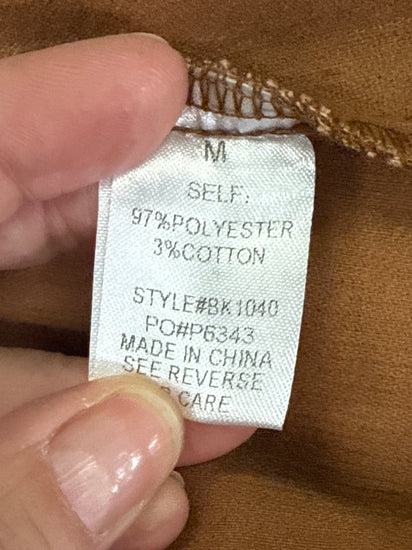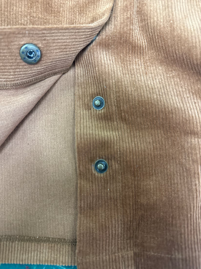 Description : Mini skirt in a warm camel corduroy with a front center row of metal snap buttons, belt loops, and vertical seam paneling for slight A-line shaping.