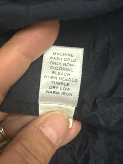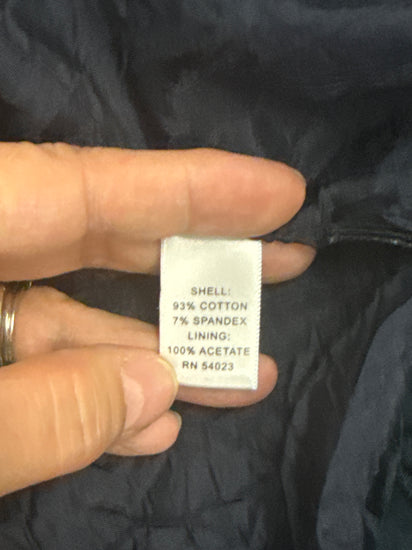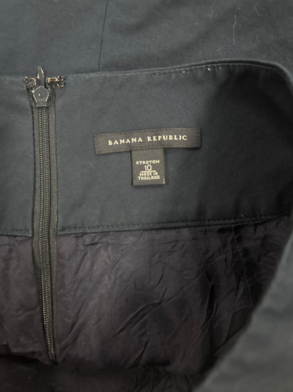 Description : Knee-length A-line skirt in solid dark navy blue with a wide waistband and a subtle center-back zipper; smooth, slightly structured fabric and a clean hem