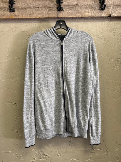 Description : Light heather grey zip-up sweater with a hood and long sleeves, featuring a black-trimmed central zipper and a lightweight, fine-knit texture. The front is simple and unadorned with a slightly relaxed fit