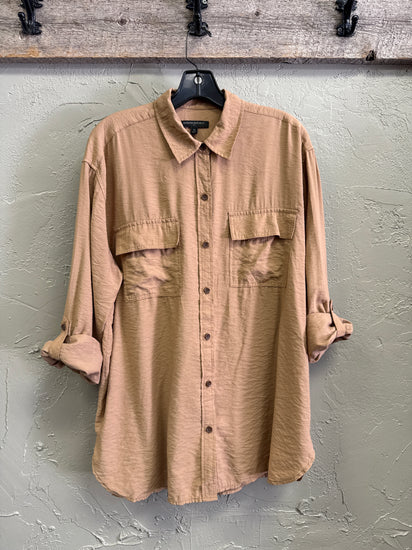 Description : Long-sleeve, collared button-up shirt in a light camel color with a slightly textured fabric, featuring two front flap chest pockets, button cuffs, and a relaxed oversized fit