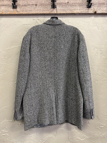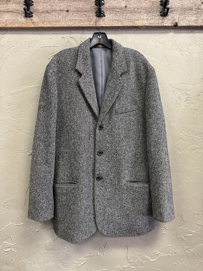 Description : Wool blazer in a grey and black herringbone pattern with notch lapels, three-button front, welt chest pocket, and two front flap pockets; fully lined interior