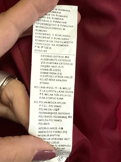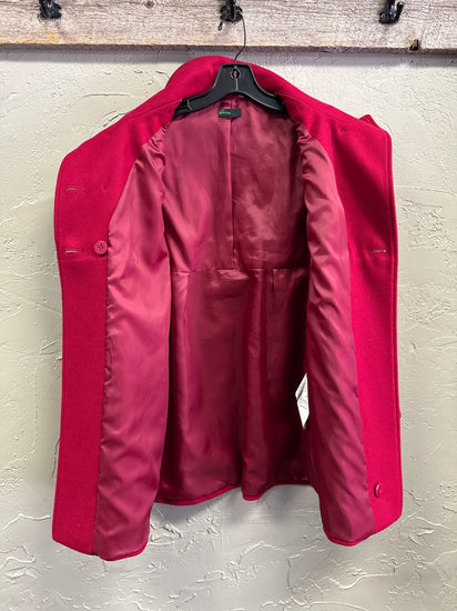 Description : A mid-thigh, double-breasted wool coat in a vivid fuchsia-red with a wide notch collar, long sleeves, princess seams, two visible waist buttons and a slightly A-line silhouette.
