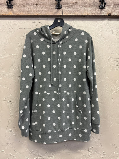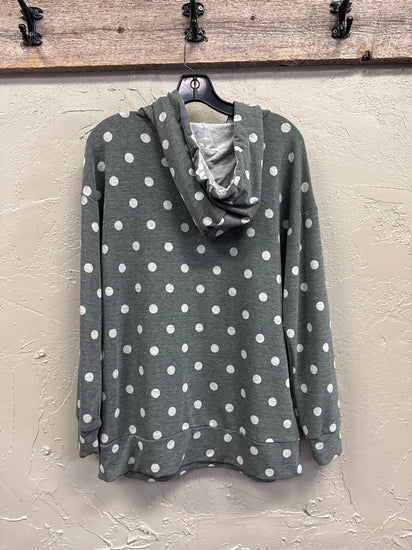 Description : Lightweight hooded pullover sweatshirt in muted green with an allover white polka dot print, front kangaroo pocket, drawstring hood, and ribbed cuffs and hem.