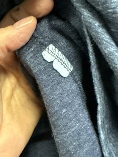 Description : Long-sleeve heathered blue hooded pullover, featuring an asymmetrical button placket with three light buttons on the left shoulder; relaxed fit with raglan sleeves and a subtle side slit at the hem. The fabric is soft and knit, giving a casual, cozy look