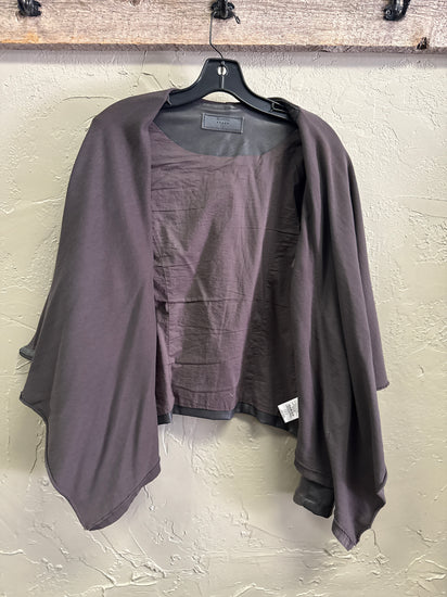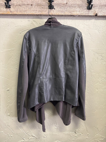Description : Chocolate brown draped moto style jacket with long sleeves and faux-leather panels on the shoulders and outer sleeves, featuring a waterfall hem and soft knit body
