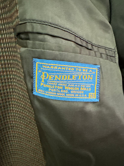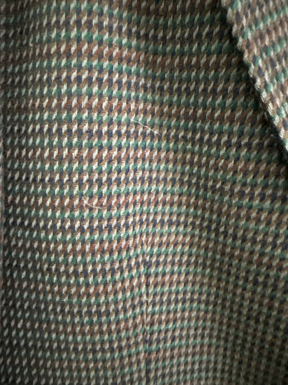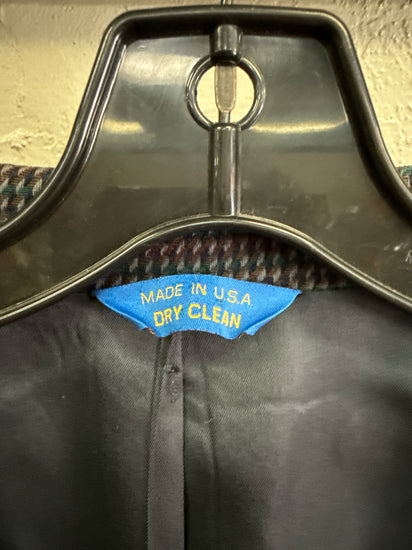 Description : Men's single-breasted blazer in a dark charcoal-gray with a subtle small-scale check pattern, notch lapels, two front flap pockets, two-button closure, and buttoned cuffs with a smooth dark inner lining visible at the front