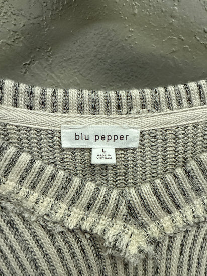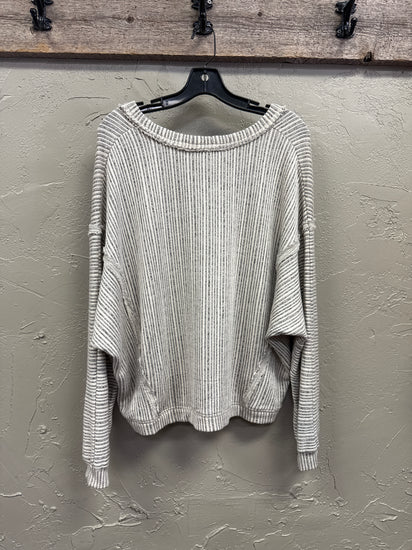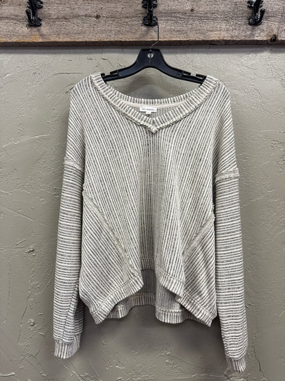 Description : Wrap yourself in comfort with the Striped Drop Shoulder V Neck Knit Top by Blu Pepper. The taupe color and drop shoulder design add a cozy touch to this stylish striped top. Perfect for a night in or a casual day out, you'll love the comfort and style this top brings