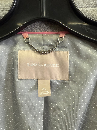 Description : Light grey wool moto-style jacket with an asymmetrical gold zipper, notched collar, two zippered front pockets and a flap pocket with a snap; long sleeves and visible seam detailing at the shoulders and waist.