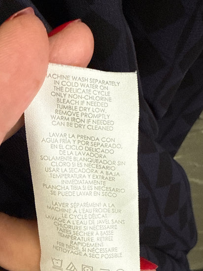 Description : A knee-length, long-sleeve shift dress in a deep navy blue with an all-over subtle geometric/diamond jacquard pattern, featuring a small V-notch at the round neckline and slightly gathered elastic cuffs. The fabric is lightweight and slightly sheer on the sleeves with an opaque body.