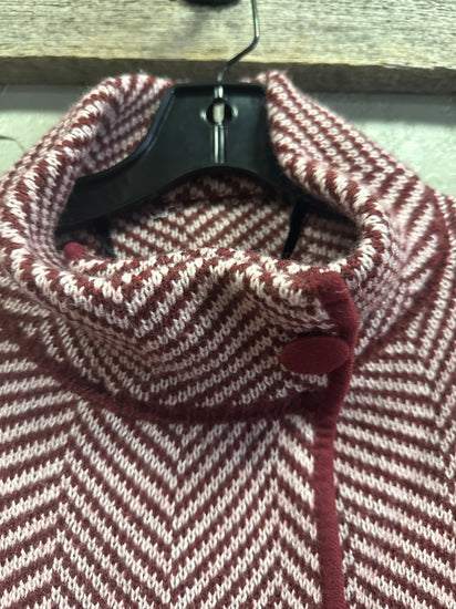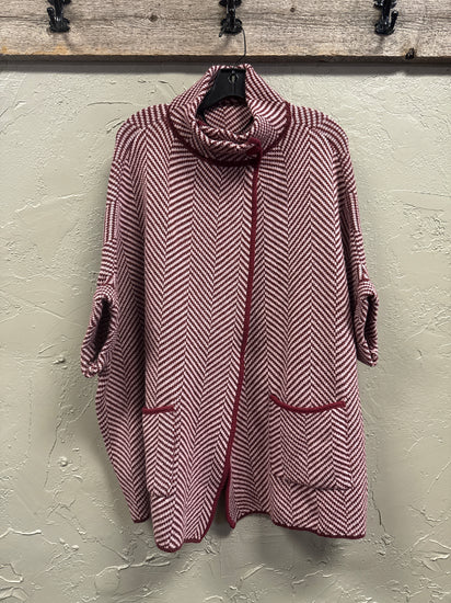 Description : A long-sleeve, oversized knit cardigan in a burgundy and cream herringbone pattern with a high funnel collar, open front trimmed in solid burgundy, and two front patch pockets.