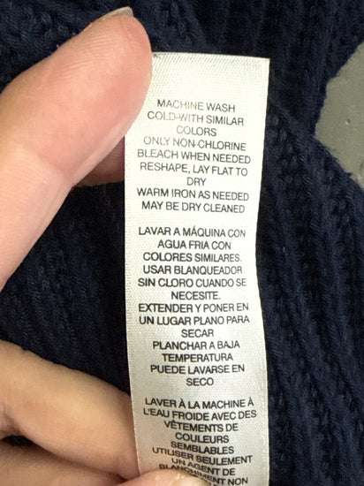 Description : Boxy navy blue knit sweater with a ribbed texture, crew neckline, drop shoulders, and elbow-length sleeves; hem and cuffs are finished with denser ribbing for structure.