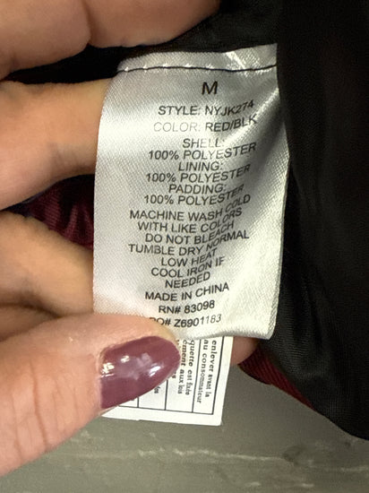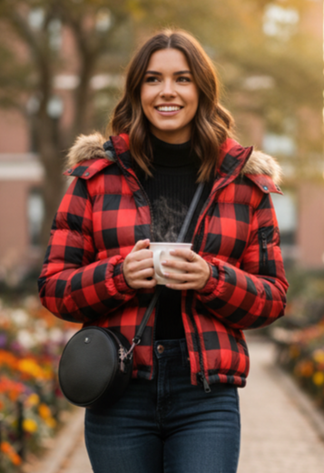 Description : Short puffer jacket in red and black buffalo plaid with horizontal quilting, a central front zipper, two slanted front pockets, a zippered sleeve pocket, and an attached hood with faux fur trim and high collar.