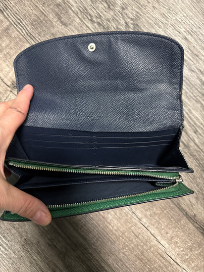 Description : The wallet is a Coach Slim Continental Wallet in Color Block with blue and green pebble leather. It has a slim design, snap closure, and features a metal logo accent.