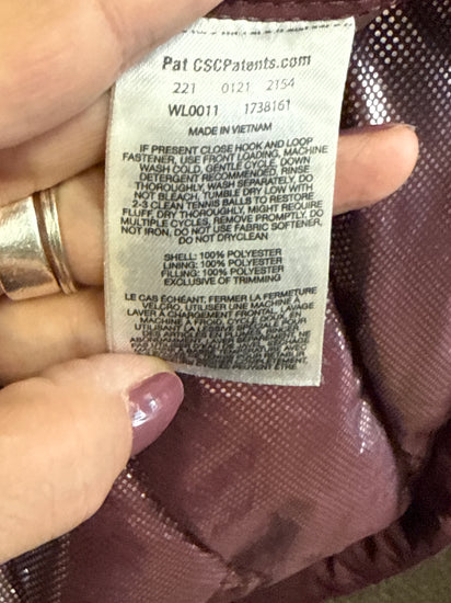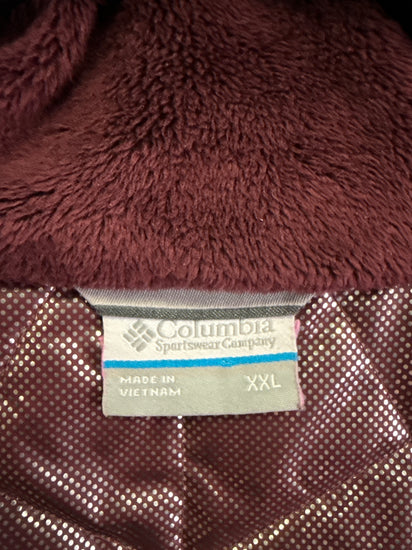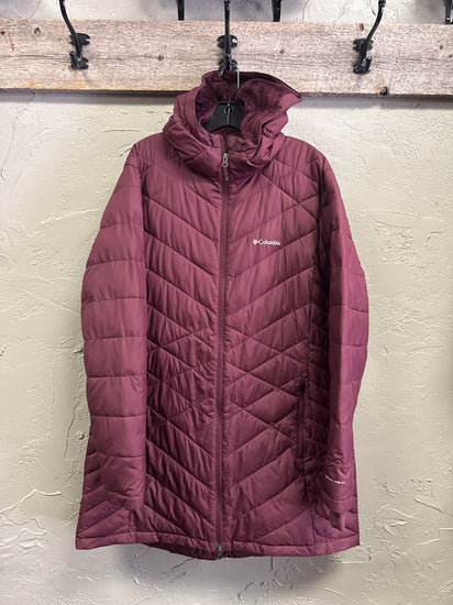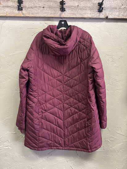 Description : Long quilted hooded jacket in deep plum/maroon with chevron quilting, a full-length front zipper, zippered side pockets, and a small Columbia logo on the chest.