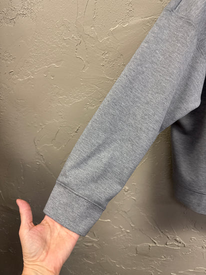 Description : A plain medium grey long-sleeve sweatshirt with a slight mock-neck, drop shoulders, ribbed cuffs and hem, and a relaxed boxy fit. The fabric is to be a soft, midweight knit with no detailing.