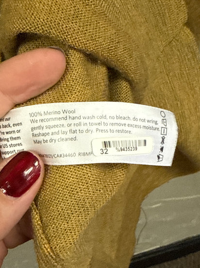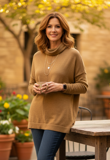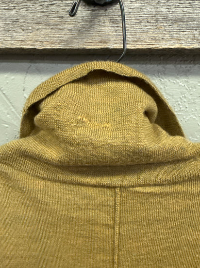 Description : Oversized long knit sweater in a warm mustard-olive tone with a relaxed turtleneck, dropped shoulders, long sleeves, and a straight hem with small side slits. The fabric is soft and lightweight with a center seam.