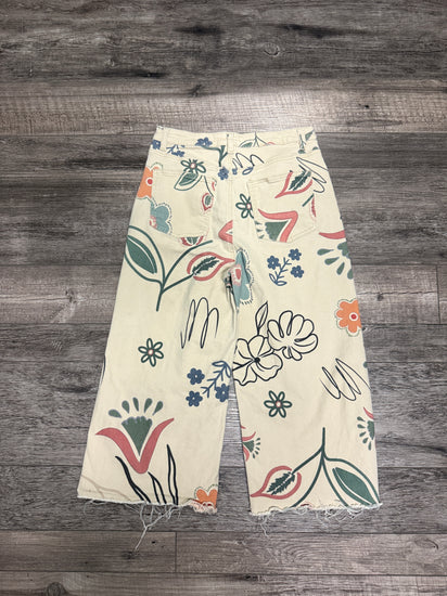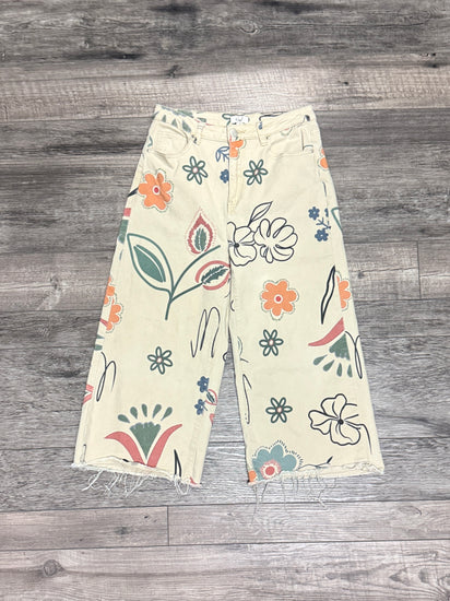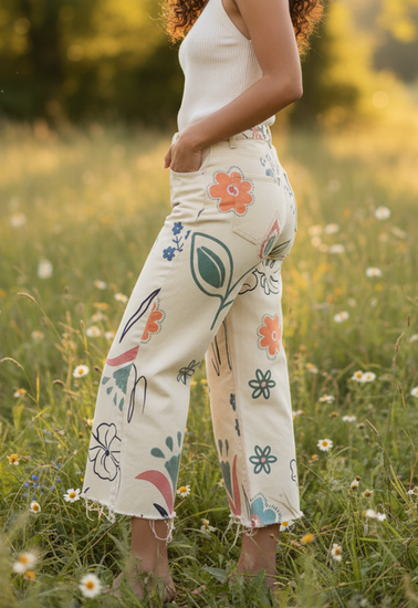 Description : Easel Brighten your day with a lively hand-drawn inspired print on the Wide Leg Pant. Featuring a zipper and single button closure, classic five pocket style and rough edge hem. Sure to add a unique feel to any look.