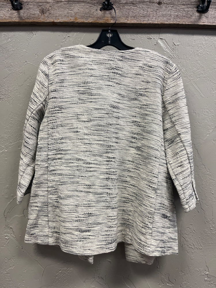 Description : Eileen Fisher sleek round neck jacket. A sophisticated style for your collection. The open front and round neck accentuate the trend-savvy design and the boxy fit shows off its modern flair. Wear with your favorite pair of dress pants and chic pumps for an office-ready ensemble.