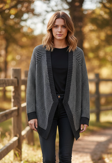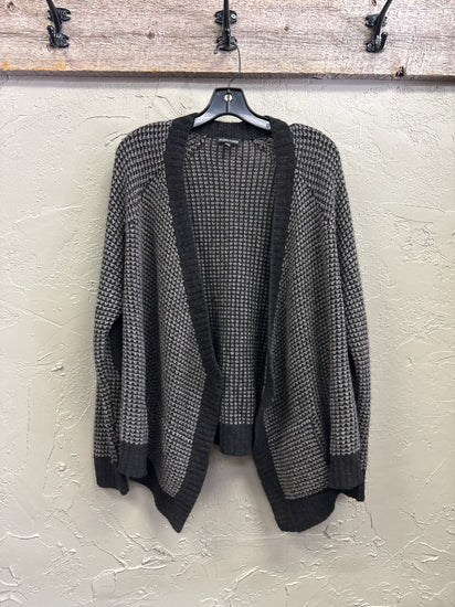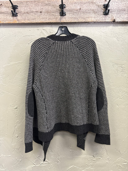 Description : Open-front long-sleeve cardigan in charcoal and light gray waffle knit with wide ribbed trim, dropped shoulders and draped pointed hem panels at the front.