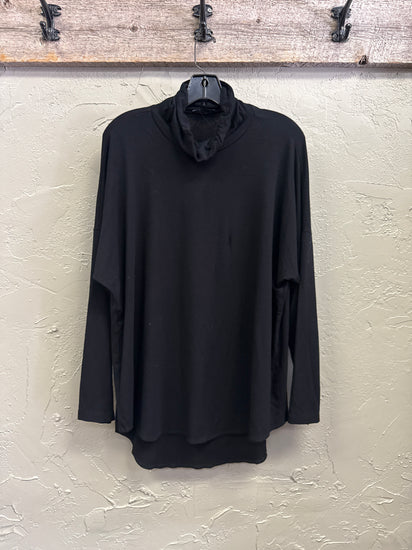 Description : Eileen Fisher long-sleeve turtleneck top in a relaxed, loose fit with dropped shoulders and a slightly elongated high-low hem; lightweight knit fabric with a simple, unadorned front. The neckline is a soft, slouchy turtleneck and the silhouette hangs straight through the body