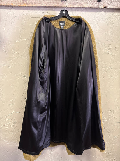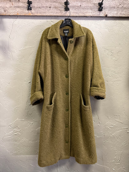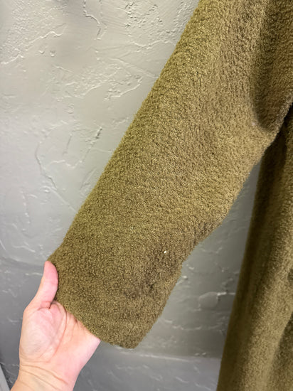 Description : Long knee-length moss-green textured bouclé coat with a button-front closure, spread collar, long sleeves with turned cuffs, and two front patch pockets. Price reflects ware on shoulder