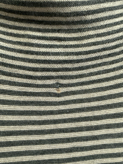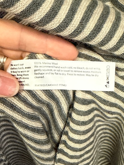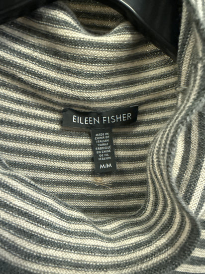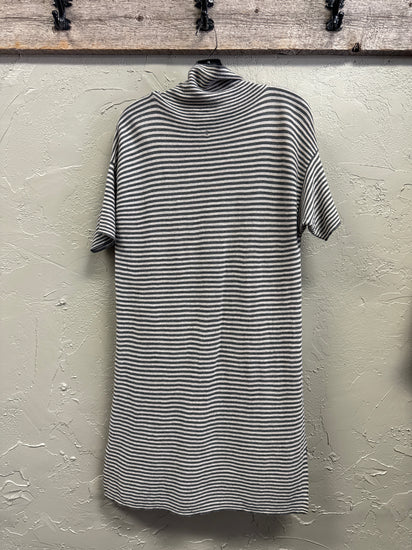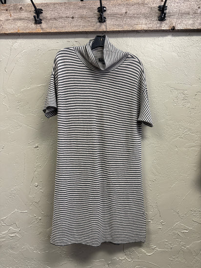 Description : Eileen Fisher Women's Medium Tunic Dress with mock turtleneck. Gray/tan striped with drop shoulder, half sleeve and split hem. Price reflects small (fixed) hole on back