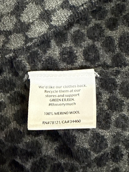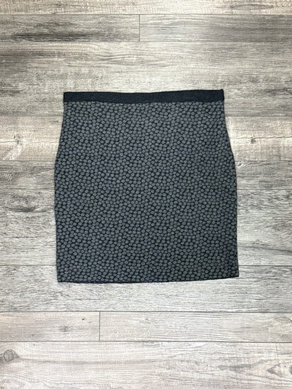 Description : Wool mini skirt in a charcoal base with an all-over small light-gray circular dot texture, straight pencil silhouette and a solid darker waistband.