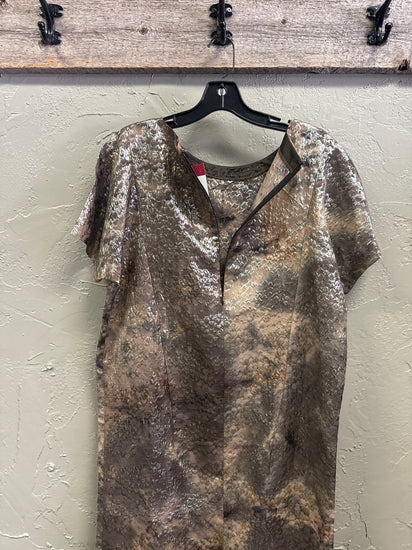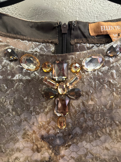 Description : Short-sleeve knee-length sheath dress in a silver/gunmetal metallic jacquard with an overall textured floral/brocade pattern and a round neckline accented with a small jewel embellishment at the front. The fabric has a shimmery finish giving it a structured, eveningwear look
