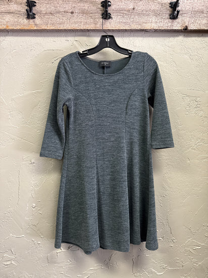 Description : Knee-length, long-sleeve A-line dress in a ribbed knit with a scoop neckline and subtle princess seams shaping the bodice. The fabric is matte and slightly textured, giving a casual, comfortable silhouette.