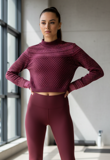 Description : Seamless, long-sleeve knit crop knit top in a deep berry color with a high crew neckline, featuring a small all-over dotted pattern and a contrasting patterned yoke and cuffs in lighter pink tones