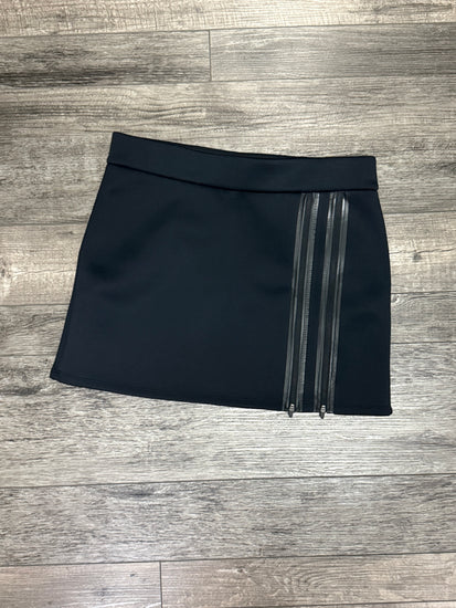 Description : Mini skirt in solid black with a straight A-line silhouette, wide waistband, and three decorative vertical zippers on the right front panel