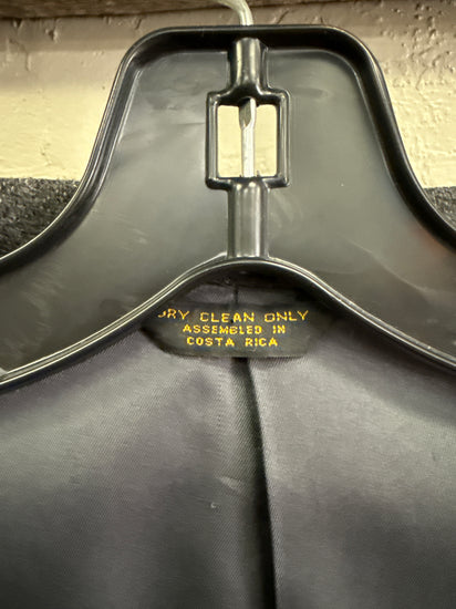 Description : Wool blazer in dark charcoal gray with a notched lapel, two-button front, flap pockets, a welt chest pocket, and a smooth dark satin lining visible at the front opening.