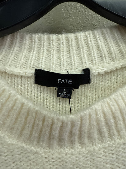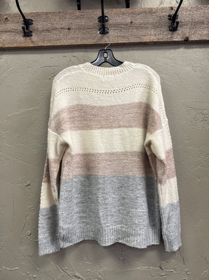 Description : Knit crewneck sweater with wide horizontal stripes in cream, blush pink, and light heather gray, featuring ribbed neckline, cuffs and hem and open-knit detailing at the shoulder seams. The relaxed long-sleeve pullover has a soft, slightly fuzzy texture.