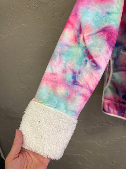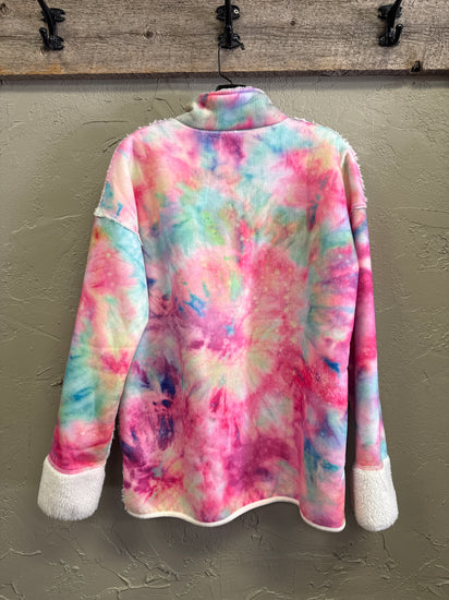Description : Pastel tie-dye quarter-zip pullover fleece in pink, aqua, mint and lavender tones with a high collar, front kangaroo pockets, exposed center zipper and sherpa-trimmed cuffs and hem