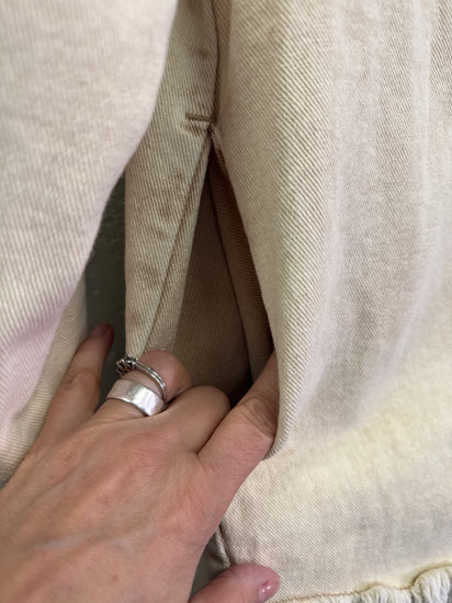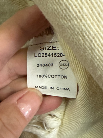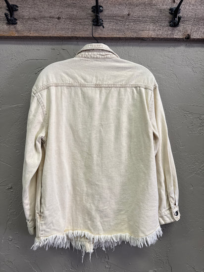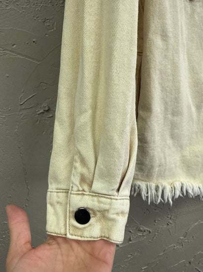 Description : Light cream denim shacket with a collared button-front, two chest flap pockets, rolled long sleeves and a raw frayed hem for a relaxed, slightly oversized look.