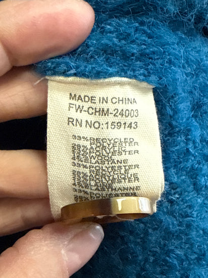 Description : Oversized, sleeveless, V-neck sweater vest in a rich teal blue color, featuring button-down closure and two front patch pockets