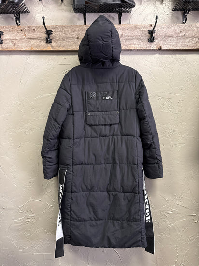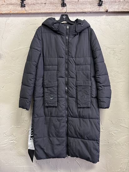Description : Long black quilted puffer coat with a hood, full-length front zipper and large flap patch pockets on the front; features horizontal baffles, drawstring hood eyelets and a metal ring zipper pull. The coat is mid-calf length and has a matte nylon finish.