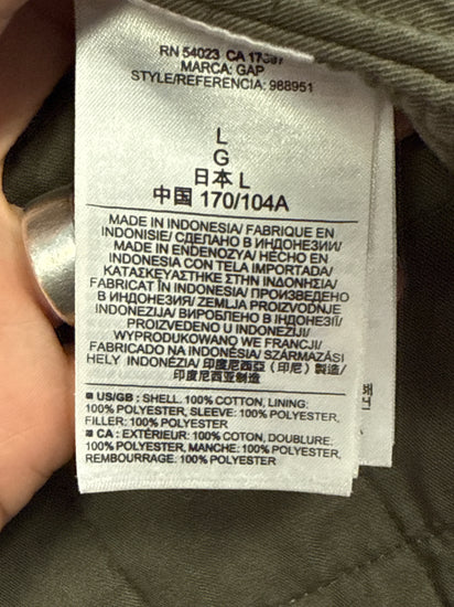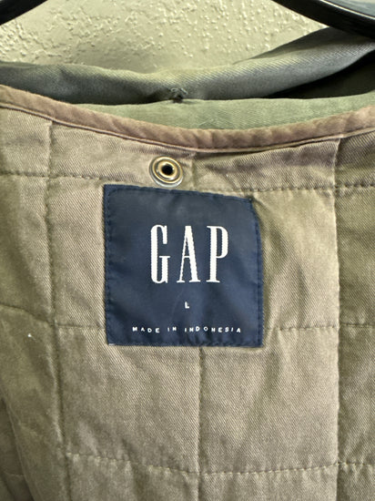 Description : Long army-green parka jacket with a detachable hood, front zip-and-button closure, drawstring hem, vertical slit hand pockets and large flap cargo pockets, plus visible seam detailing and a slightly washed cotton fabric.