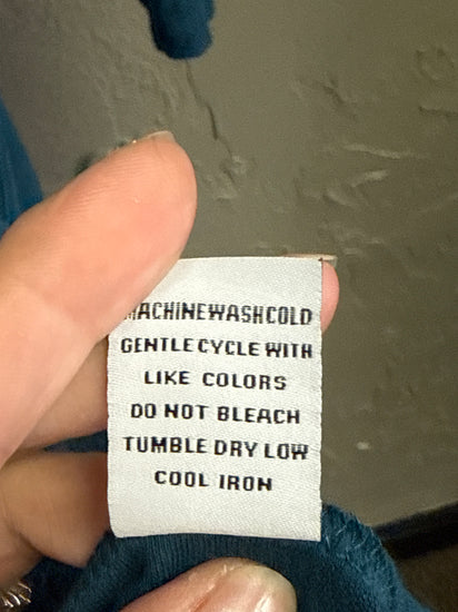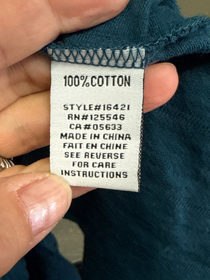 Description : Long-sleeve teal tunic with a draped cowl neckline, A-line loose fit and asymmetrical hem, featuring subtle diagonal ribbed texture across the front. The fabric is matte and slightly heavy, giving a relaxed, flowing silhouette.