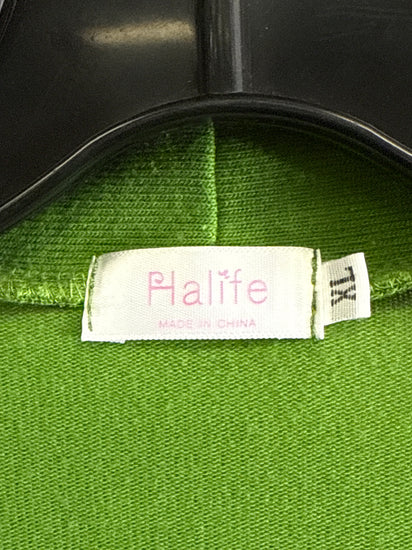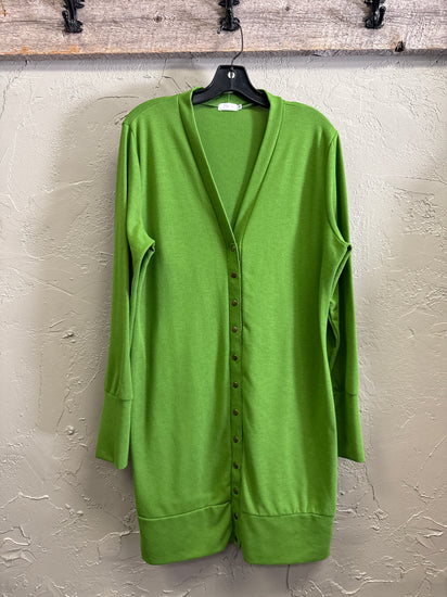 Description : Long snap-front cardigan in a bright grassy green with a V-neck, full-length sleeves, metal snaps down the center, and a wide hem band at the bottom