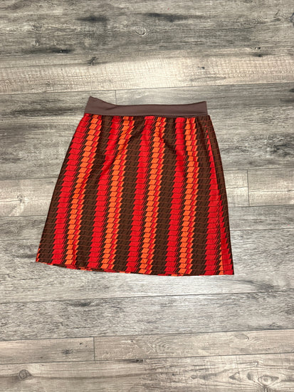 Description : Handmade A-line skirt with a brown elastic waistband and a textured diagonal stripe pattern in warm reds, oranges and deep brown, made from vintage knit fabric.